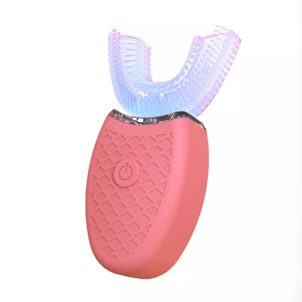 Unlike traditional toothbrushes that only clean where the bristles touch, the 360° design envelops your teeth, ensuring all surfaces — front, back, and in between — are cleaned simultaneously. The U-shaped mouthpiece fits comfortably and moves with ultrasonic vibration to remove plaque and debris from every angle, saving time and improving consistency in daily oral care.